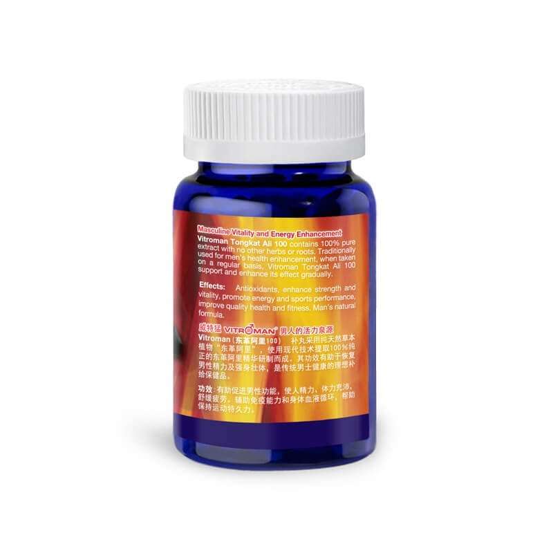 Vitroman(东革阿里100%)补丸是以科学新突破为依据,以草本植物”东革阿里”为主要成份(不含其他草药成份),使用『分离超细』技术提取100%纯正的东革阿里精华,研制而成,其高纯性精华有助于男性強身壮体,全草本的天然配方是男士增强健康的理想补品。