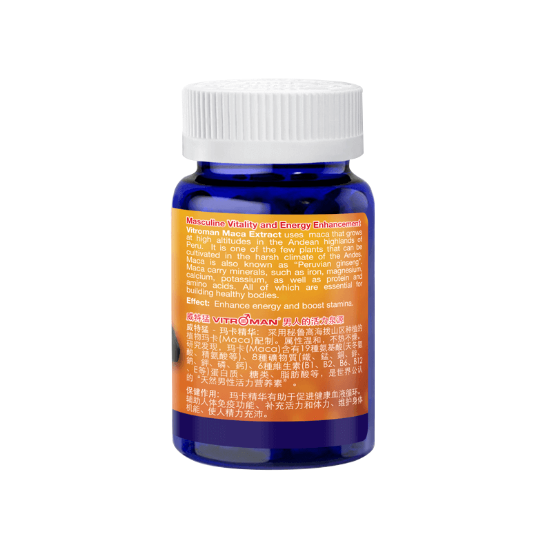 Vitroman Maca Extract 威特猛-玛卡精华: 采用秘鲁高海拨山区种植的植物玛卡 (Maca ) 配制。主要成分为玛卡,在配合东革阿里、淫羊霍三种男性壮阳草本配方制成。属性温和,不热不燥。研究发现,玛卡(Maca)含有19種氨基酸(天冬氨 酸、精氨酸等)、8種礦物質(鐵、錳、銅、鋅、鈉、鉀、磷、鈣)、6種維生素(B1、B2、B6、B12、E等)蛋白质、糖类、脂肪酸等,是世界公认的 “天然男性活力营养素” 。玛卡 (Maca) 具备多种保健功能: 改善更年期综合征、风湿症、抑郁症状、贫血症,抗疲劳,激励脑力,补充体力。它还可以纾缓压力、补充能量和增进健康,人体疲劳时补充,可以抗疲勞且不透支身體、加强新陈代谢且無任何副作用。