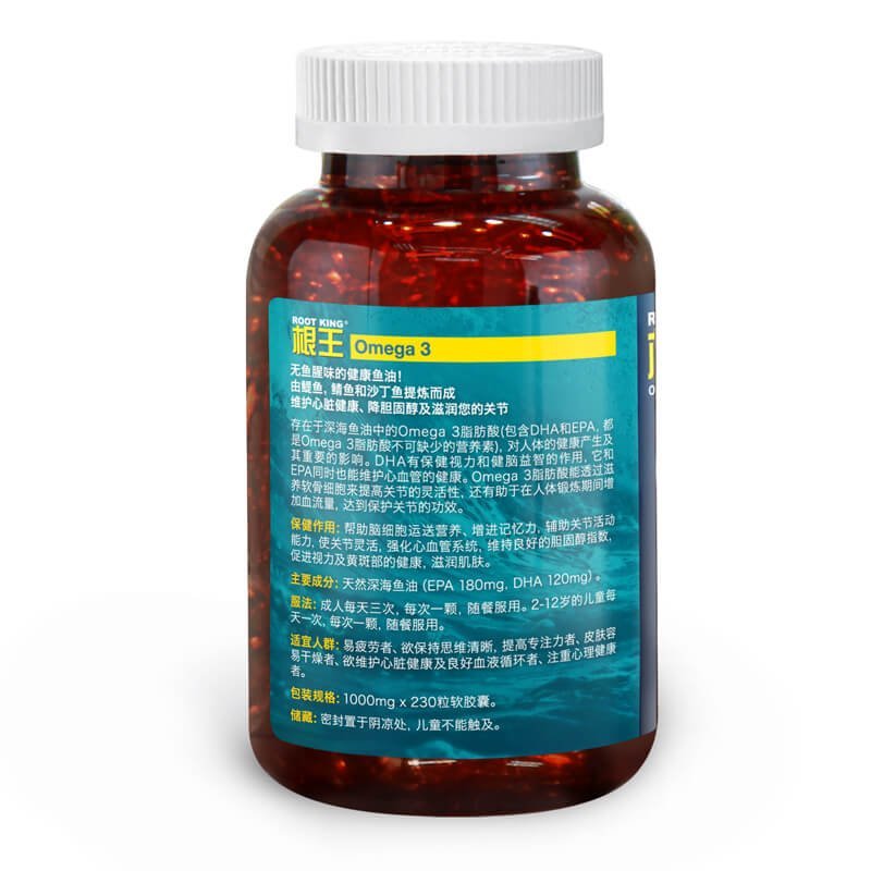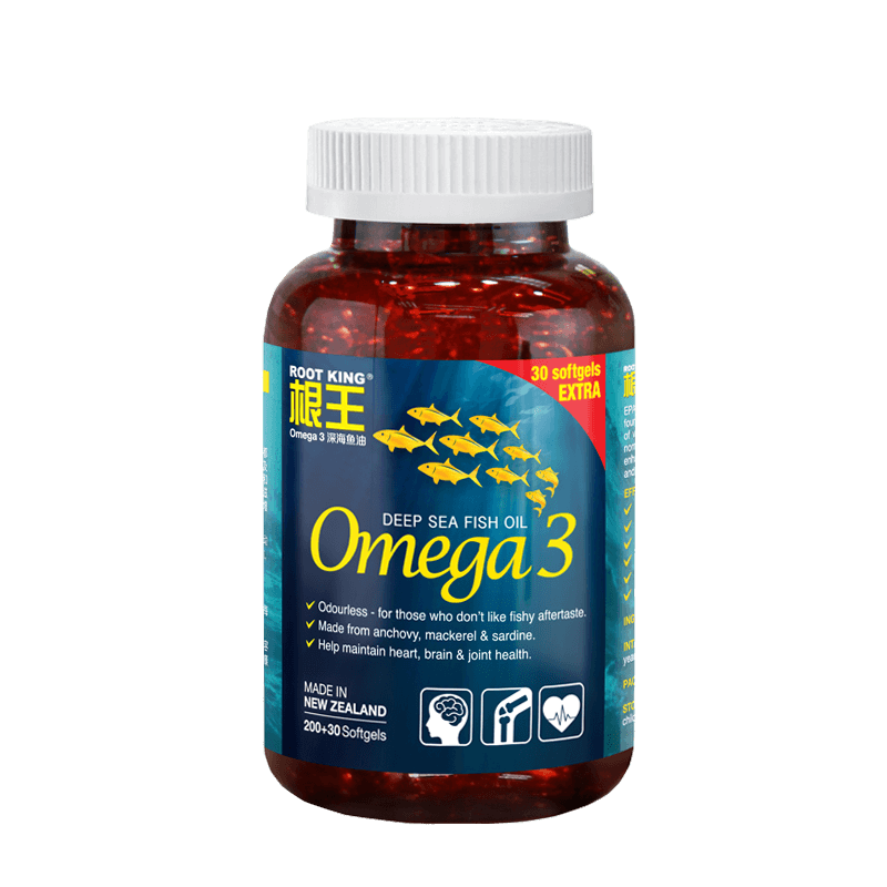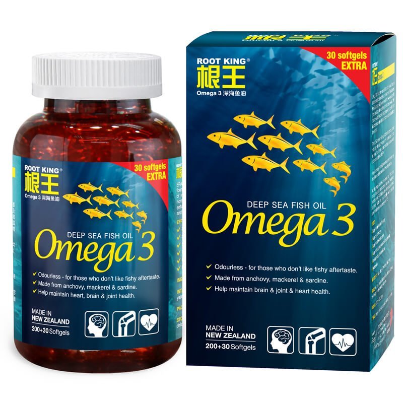 新加坡的天然保健品牌 – 根王(Root King)推出的 Omega 3 深海鱼油,是一款无鱼腥味的健康鱼油保健品。由海洋中的小型鱼类:鳀鱼、鲭鱼和沙丁鱼透过温和萃取提炼而成,因其含有高浓度的 EPA 和 DHA。由于这类小型鱼类的生命周期短暂,能够避免吸收更多潜在于海洋的环境毒素,如水银和多氯联苯等,让人体能吸收品质更好的鱼油精华来达到保健目的。