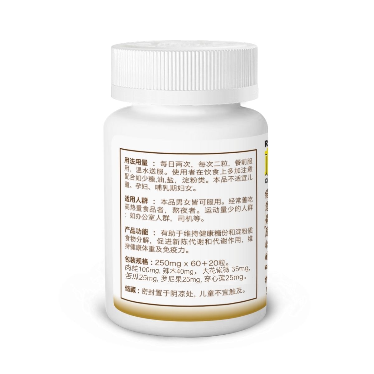 成分:Cinnamon 100mg, Moringa Oleifera 40mg, Banaba 35mg, Bitter Melon 25mg, Noni 25mg, Andrographis 25mg