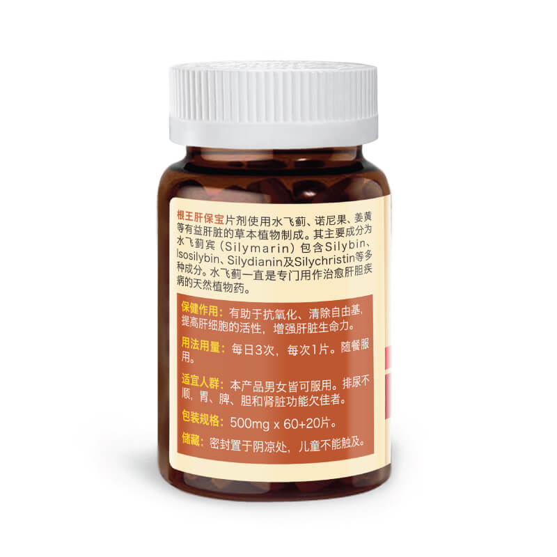 根王肝保宝使用水飞蓟、诺尼果、姜黄等有益肝脏的草本植物制成。其主要成分为水飞蓟宾(Silymarin)包含Silybin、lsosilybin、Silydianin及Silychristin等多种成分。Silymarin 是一种天然的黄酮木脂素类化合物,是专门用作治愈肝胆疾病的天然植物药。